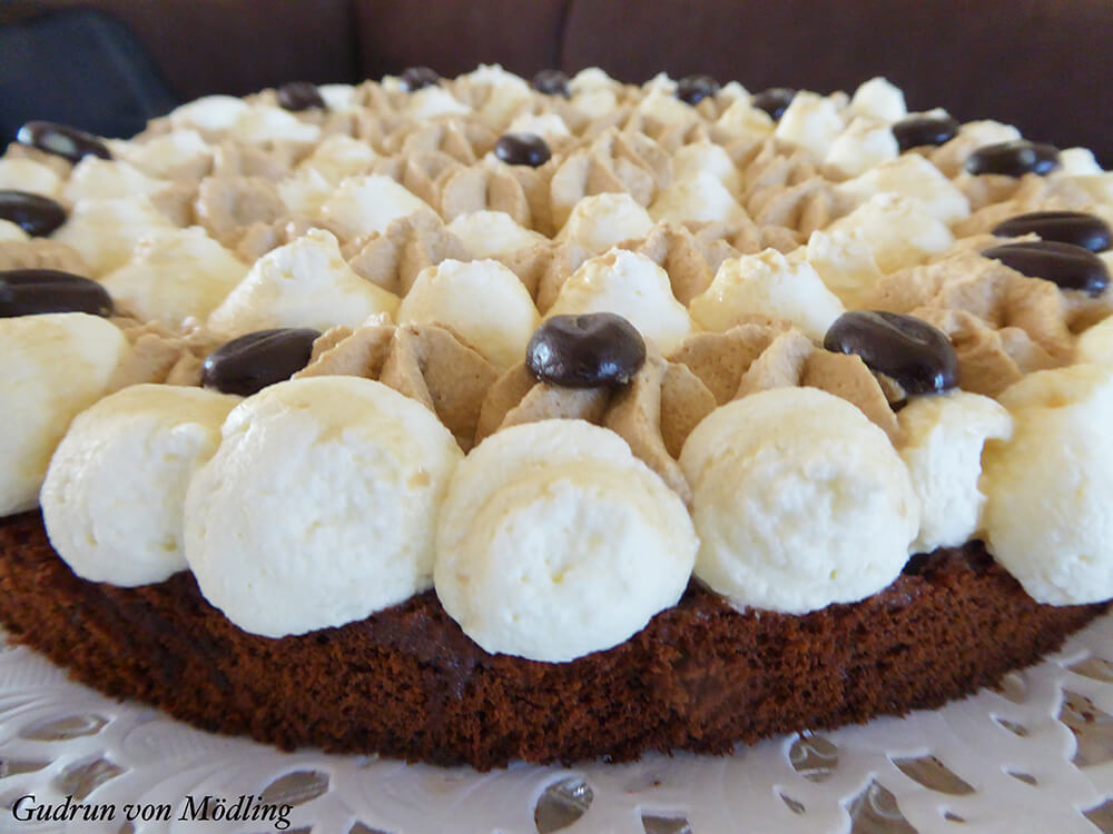 Na, ja, was nun? Alle erwarteten eine Torte für den Nachmittagskaffee von mir….. Ich habe dann einfach Schlagobers, das ich steif geschlagen habe, mit einem Schuss Baileys Likör und ein paar Esslöffel kalten, sehr starke Kaffee vermischt und den verbliebenen Boden damit dekoriert. Darüber hab ich noch ein bisschen Baileys Likör gegossen und mit Schoko-Bohnen verziert.