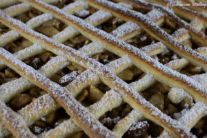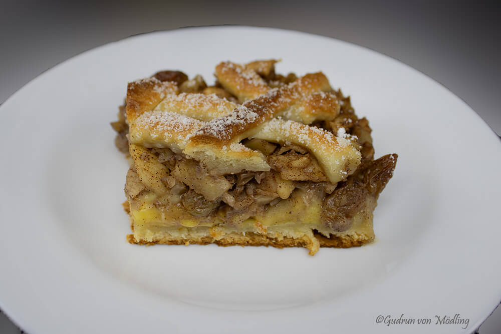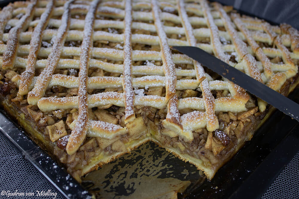Das restliche Drittel des Teiges ausrollen und in Streifen schneiden, Diese dann gitterförmig auf die Apfelfülle legen.