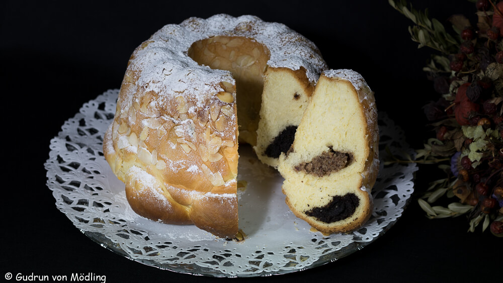 „Batzl“ „Patzerln“ sind umgangssprachlich „kleine Mengen“ Hier sind es mittelgroße Teigstücke, die mit „Batzerl“ – also ein wenig – Fülle gefüllt werden und dann versetzt in die Gugelhupf Form gegeben werden, so dass beim Anschneiden von mindestens 2 verschiedenen Füllungen etwas im Stück ist 🙂 Mit viel Glück hat sogar von allen 🙂 Dann isst Du gleich ein zweites Stück davon – dann hast Du sicher alle 4 Füllungen genossen. Er schmeckt himmlisch und man kann nicht widerstehen 🙂