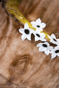 Es gibt Schablonen mit Baumrindenmuster, die ich zufällig besitze, diese hab ich dann auf das Fondant gedrückt und mit der geprägten Seite nach außen um die Torten gelegt.