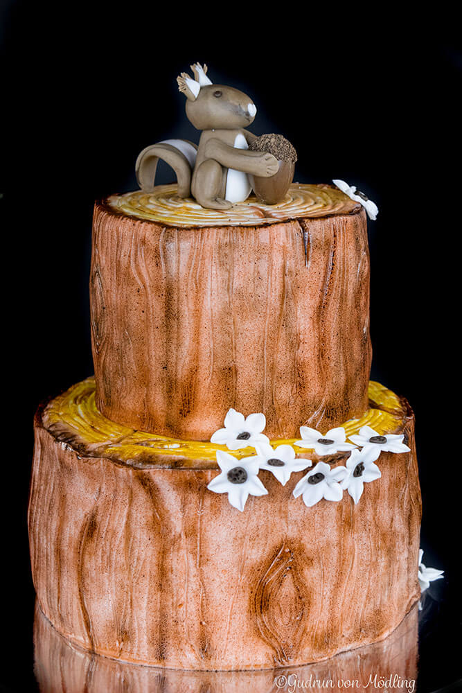 Die Tochter meiner Freundin Anja wird 8 Jahre alt und hat sich von mir eine Torte gewünscht. Sie liebt Sacher und als Motiv hat sie sich einen Baumstamm mit einem Eichhörnchen darauf gewünscht. Ich habe mein Bestes gegeben und sie war hin und weg.