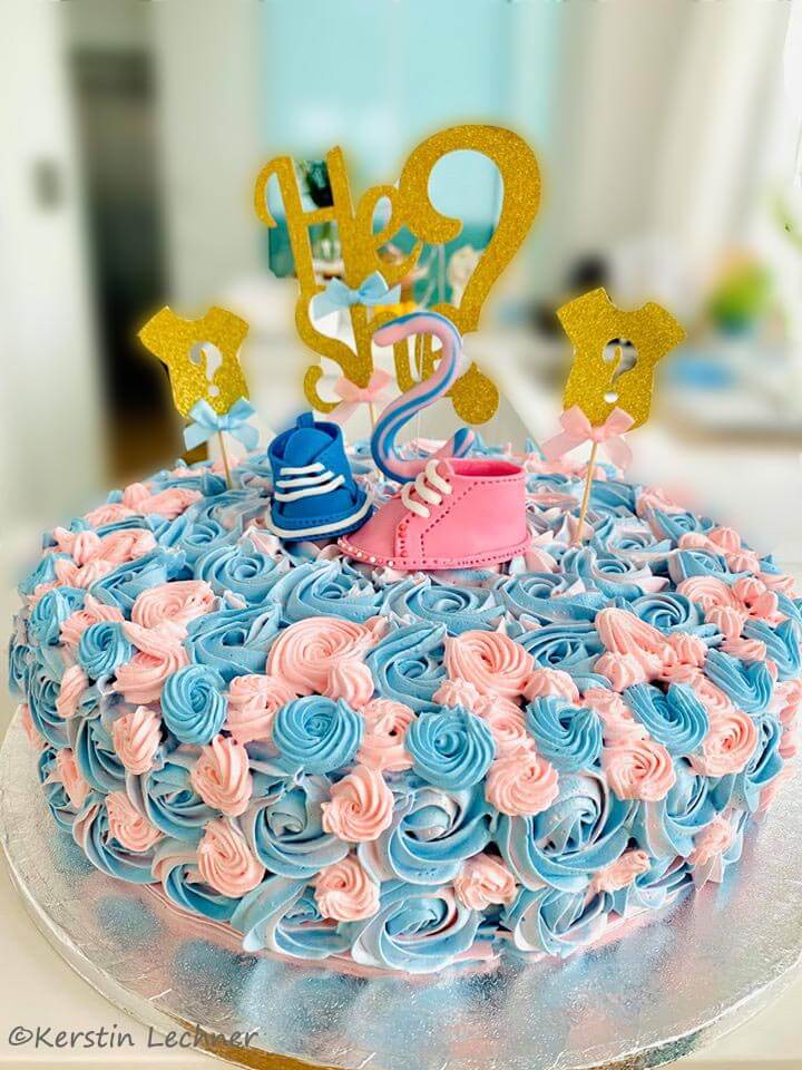 Welch eine riesen Freude 🙂 Ich hatte die Ehre für Kerstin die Torte für ihre Baby Party zu machen. Meine Aufregung war groß. Kerstin hat sich eine Torte mit rosa und hellblauen Rosen und mit zwei verschiedenfärbigen Babyschuhen gewünscht. Die Gäste wussten noch nicht – ob es ein Bub oder ein Mädchen wird. Nicht mal der werdende Papa 🙂 Nur Mama Kerstin, ihr Arzt und ich 🙂