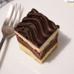 Ich habe den gebackenen Kuchen auf eine Platte gesetzt und die noch flüssige Schokolade über die Creme geleert und gleichmäßig verteilt. Bei Zimmertemperatur habe ich die Schokolade etwas auskühlen lassen und habe dann mit einem gezackten Tortenspatel die typischen Wellen gezogen. Die Schokolade sollte dazu halb fest sein.