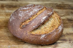 Ich habe daraufhin meine angefangen Mehlpackungen angesehen und abgewogen. Vom Roggenmehl war genau 305 g noch übrig 🙂 Damit der Laib nicht zu klein ausfällt, habe ich einfach verschiedene Mehle gemischt. Und daraus ist dieses Brot entstanden. Krumme knusprig, innen richtig „saftig“ Und durch die lange Reifezeit schön würzig.