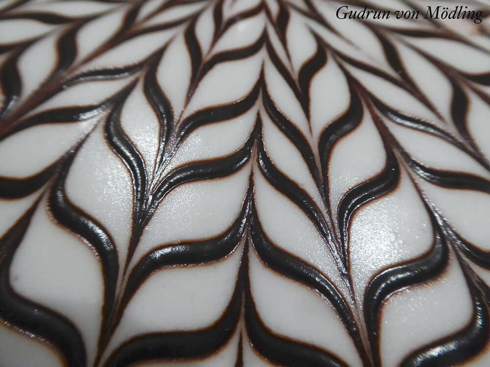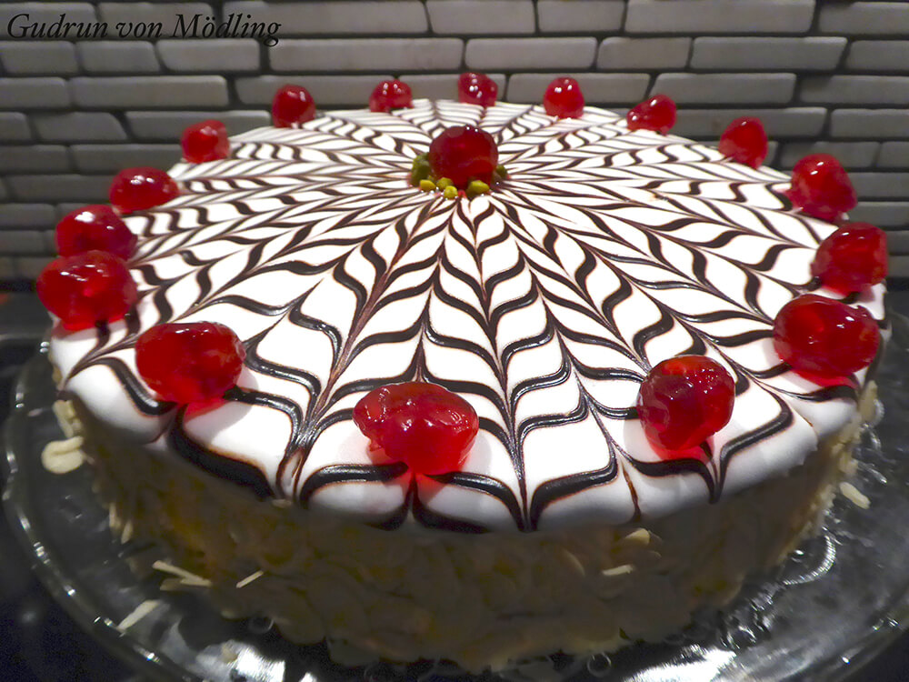Den übrig gebliebenen Boden auf einen passenden Tortenbackformboden setzen, zunächst mit der weißen Glasur überziehen und, während diese noch weich ist, die dunkle Glasur in ein Papierstanitzel füllen. Damit einige Kreise ziehen. Mit einem Zahnstocher ein Fischgräten artiges dunkle Muster hineinmalen. Glasur leicht stocken lassen und vorsichtig auf die Torte gleiten lassen. Den Tortenrand mit restlicher Buttercreme bestreichen und mit gerösteten Mandelblättchen bestreuen. Mit den Kirschen dekorieren.
