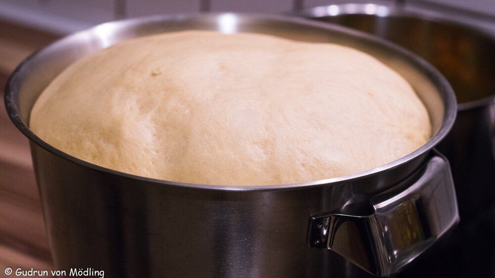 Alle Zutaten der Reihe nach in eine Schüssel geben. Mindestens 10 Minuten in der Küchenmaschine kneten. Der Teig soll weich, aber formbar sein. Zugedeckt an einem warmen Ort so lange gehen lassen, bis sich das Teigvolumen verdoppelt hat.