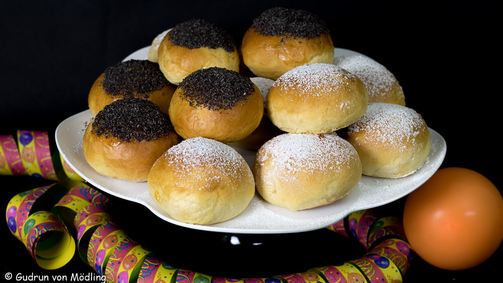 Eine weiter Variante ist den Krapfen mit Powidl Marmelade zu füllen, die Oberfläche der Krapfen in noch möglichst heißem Zustand mit gekochter Marillenmarmelade bepinseln und dann in geriebenem Mohn tauchen.