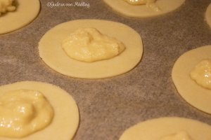 Kreise mit einem Durchesser von 9 cm ausstechen. Nicht zu knapp nebeneinander, sie gehen noch ordentlich auf, auf ein, mit Backpapier ausgelegtes Backblech legen. Ca. 2 TL der Mandelmasse in die Mitte des Teigkreises geben.