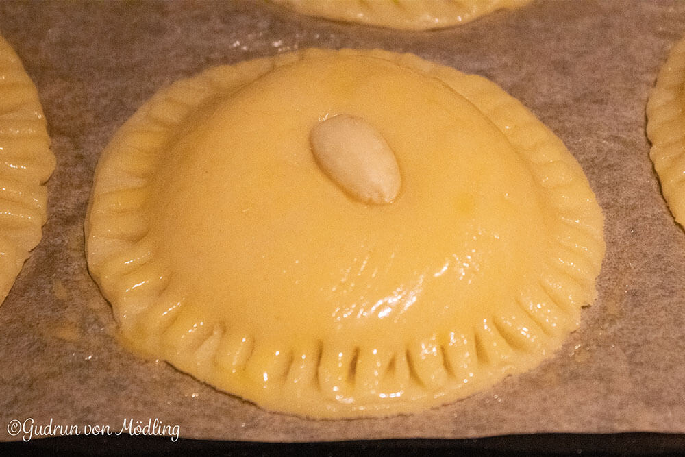 Die Oberseite mit einem verquirlten Ei bestreichen, die Ränder nur ganz zart, die werden sonst schnell dunkel, und eine Mandel in die Mitte legen. Nun die „Kuchen“ auf mittlerer Schiene ca. 15 min bei 175°C Ober-/Unterhitze goldbraun backen.