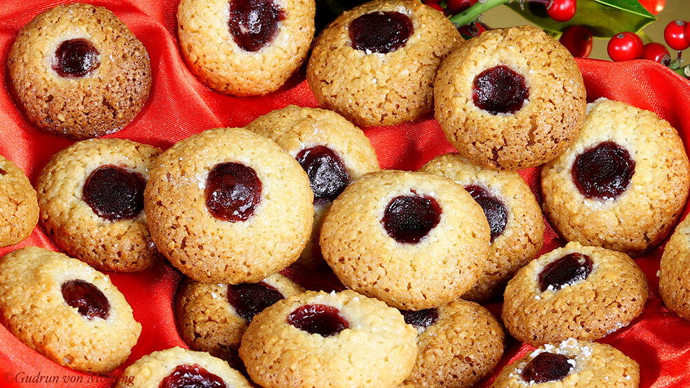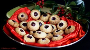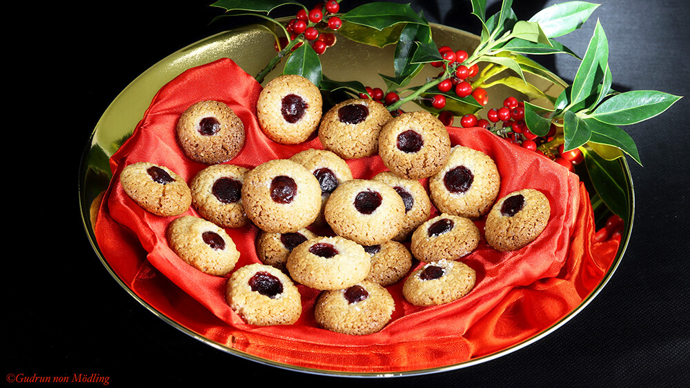 Mit einem runden Holzkochlöffelstiel kleine Mulden in die Kugeln drücken. Marmelade/Konfitüre glatt rühren, in einen Einwegspritzsack oder Gefrierbeutel füllen. Eine kleine Ecke abschneiden. Marmelade in die Teigmulden spritzen. Ca. 15 Minuten auf Sicht backen. Zu dunkel sollen sie nicht werden. Herausnehmen und abkühlen lassen.