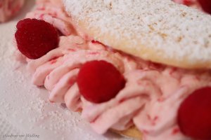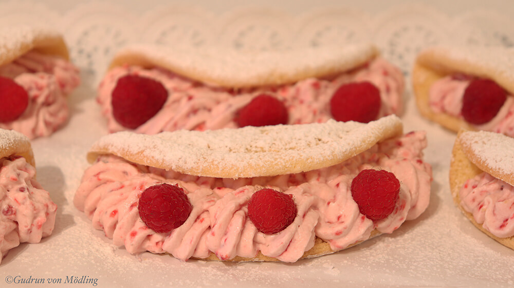 Die Masse in einen Spritzsack füllen, Omeletts leicht aufbiegen, so dass ihr die Creme hineinspritzen könnt, und die Himbeercreme auf dressieren. wieder leicht zusammendrücken, mit Staubzucker bestreuen und mit Himbeeren garnieren.