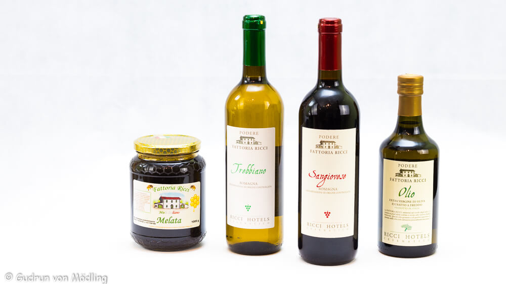 Natürliche, biologische Produkte aus hoteleigenem Anbau aus der Emilia Romagna, einer Region, die für die Qualität ihrer Erzeugnisse bekannt ist. Die Produkte werden selbstverständlich auch in den eigenen Hotelküchen verwendet: Honig zum Frühstück, Olivenöl für nahezu alle Gerichte und die Weine zu einem gepflegten Menü.