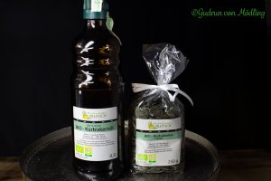 Er vertreibt unter anderem auch Leinöl, Mohnöl und Rapsöl. Kürbiskerne natur, geröstet und gesalzen und ein himmlisches Kürbiskern Pesto verkauft er auch.