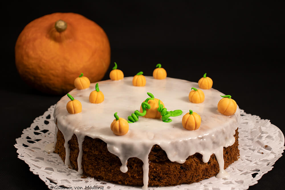 Nach Belieben mit Kürbissen aus Marzipan oder Fondant dekorieren. Meine habe ich aus Fondant gemacht 🙂