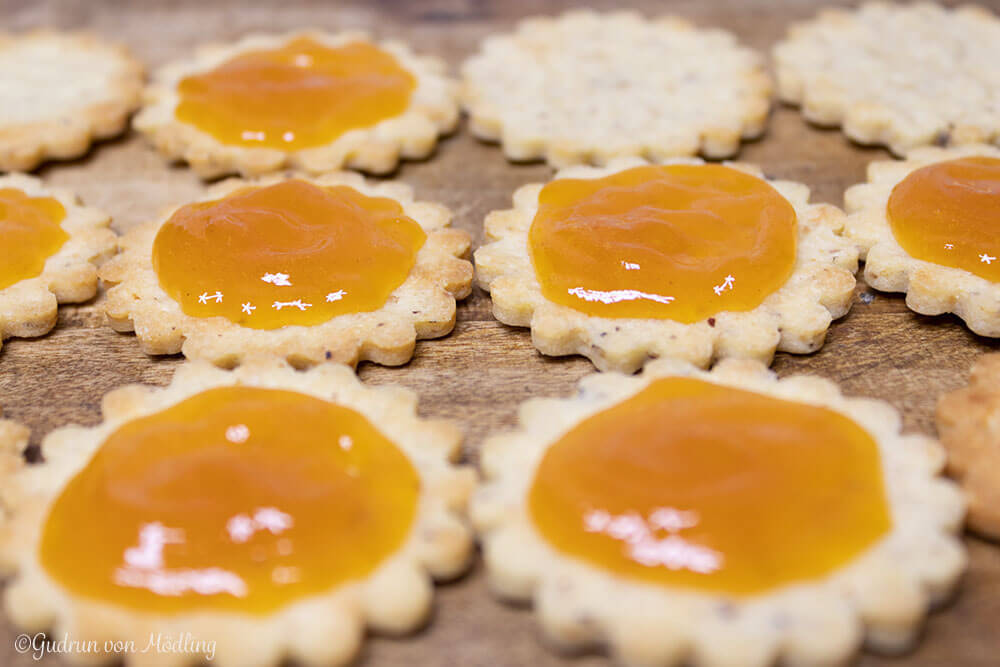 Danach die Kekse ohne Loch/Löchern mit Marmelade bestreichen und mit einem Keks mit Loch/Löchern zusammensetzen.