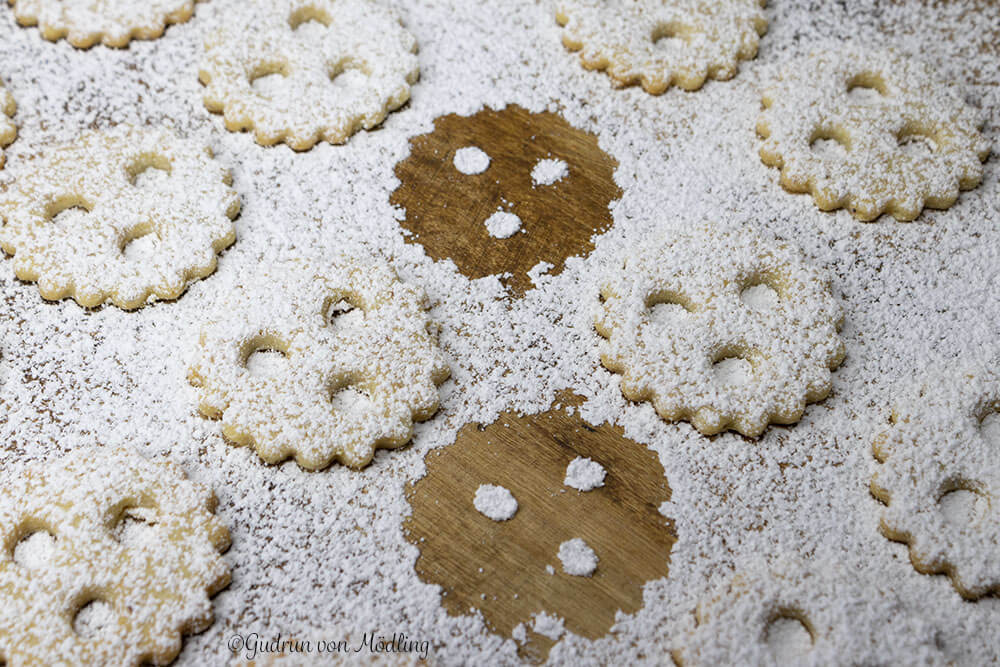 Die Kekse mit Löchern – Sternen – Herzen, oder was immer ihr für Formen genommen habt, mit Staubzucker bestreuen.