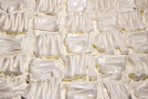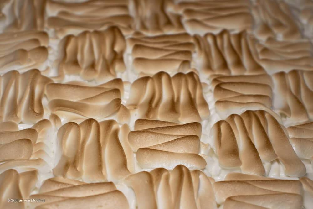 Den Kuchen aus dem Rohr nehmen, den Eischnee gleichmäßig auf die Topfenmasse streichen (oder diverse Muster mit dem Spritzsack und einer Tülle nach Wahl).