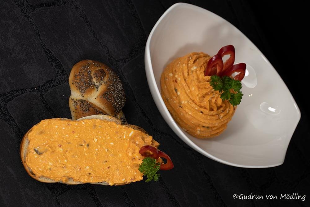 Als Vorspeise gab es verschiedene Aufstriche: Liptauer, Kürbiskernaufstrich, Schinkenaufstrich und Grammelaufstrich. Und etwas ganz leckeres: gekochte Schweinsbackerl mit Kren. Dazu reichten wir die frisch gemachten Mohnflesserln, Salzstangerl und Brot.