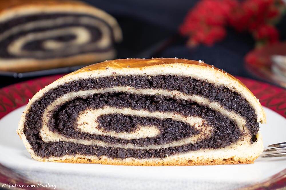 Etwas Mehl auf eurer Arbeitsfläche verteilen, den Teig nochmals gut durchkneten. Dann mit einem Nudelholz zu einer rechteckigen Fläche ca. 35×45 cm ausrollen. Die Mohnfülle auf dem Teig verteilen, einrollen und die Enden gut verschließen. Danach den Strudel auf ein befettetes Backblech legen und nochmals 20 Minuten gehen lassen.