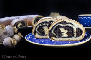Hier das Rezept wie immer zum Ausdrucken: Mohnstrudel mit beschwipsten Pflaumen