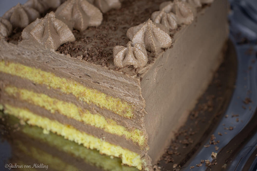 2/3 der Creme auf die Böden streichen, zusammensetzen und mit dem Rest die Schnitte einstreichen und nach belieben dekorieren. Mind. 4 Stunden kühlen, am Besten aber über Nacht.
