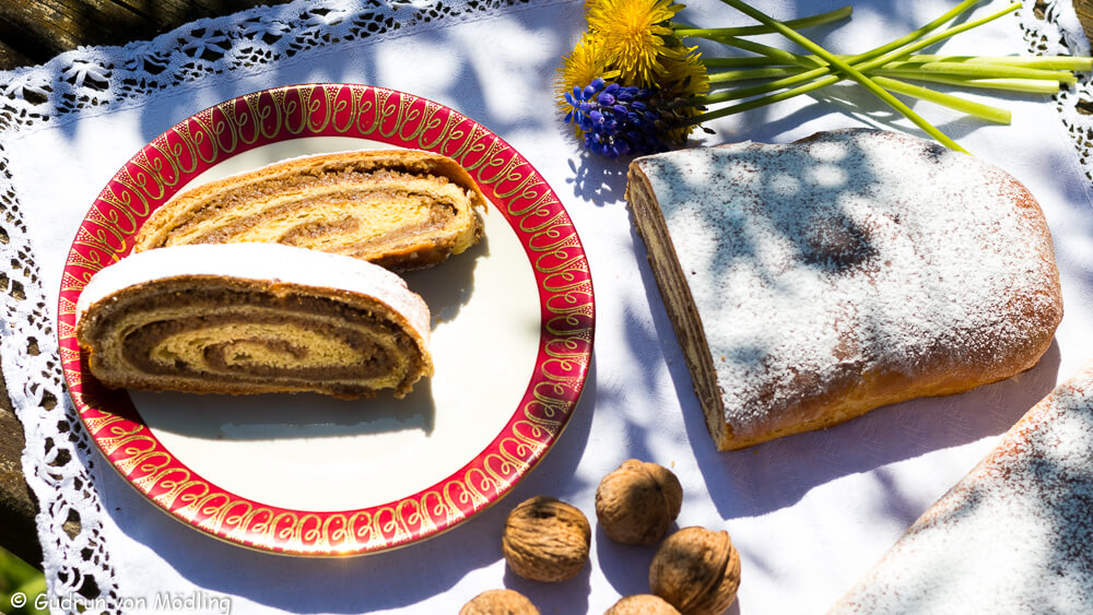 Für den Teig 2/3 des Mehles und die restlichen Zutaten in eine Schüssel geben und den Teig so lange schlagen bis er Blasen wirft. Geht am besten mit einem Kochlöffel oder auch ganz einfach in der Küchenmaschine mit dem Knethacken. Dann das restliche Mehl unterkneten. Der Teig sollte dann einfach schön geschmeidig sein. Zugedeckt an einem warmen Ort ca. 30 Minuten rasten lassen. Noch einmal schön kneten und dann rechteckig ausrollen, ca. 25 x 60 cm, und auf 25 x 30 cm halbieren. Die Nussmasse auf die beiden Teile aufteilen und einrollen. Auf ein Backpapier legen und mit einer Eidotter/Milchmischung bestreichen und nochmals ca. 30 Minuten gehen lassen. Mit einer Gabel an der Oberseite ein paar mal einstechen damit der Teig beim Backen nicht reißt.