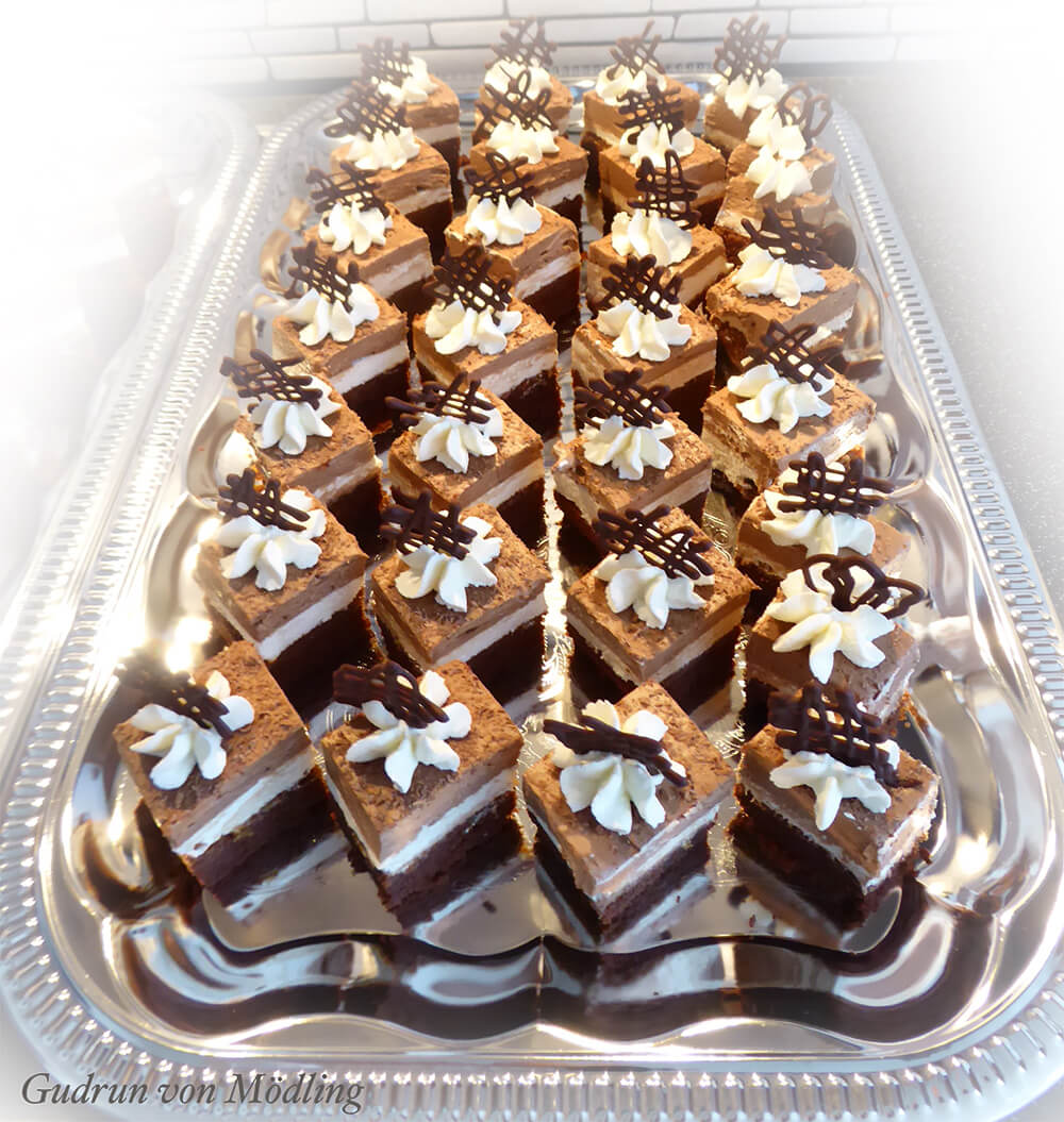 Ich habe die Schnitten in Würfel geschnitten, mit einem Tupfer Schlagobers versehen und Schokodeko die ich selbst gemacht habe, darauf gesteckt.