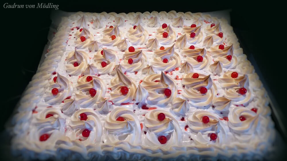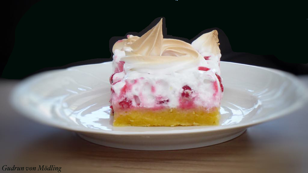 Anmerkung: Da in einigen Foren das Bild meines Anschnittes mit dem Kommentar: „speckig“ versehen wurde, muss ich folgendes festhalten: Der Teig ist sehr fettig, und dadurch zergeht er auf der Zunge. Man darf sich diesen Teig nicht so wie einen normalen Kuchenteig vorstellen, er ist einfach anders, schwer zu beschreiben. Mit dem Schnee/Ribiselgemisch harmoniert das aber perfekt. Meine Arbeitskollegen haben sich diesmal noch mehr überschlagen mit ihrem Lob als sonst. Wenn Ihr die Schnitte in den Kühlschrank stellt, wird der Boden fester – eh klar – durch den hohen Anteil an Butter. Ich mag ihn aber so nicht.