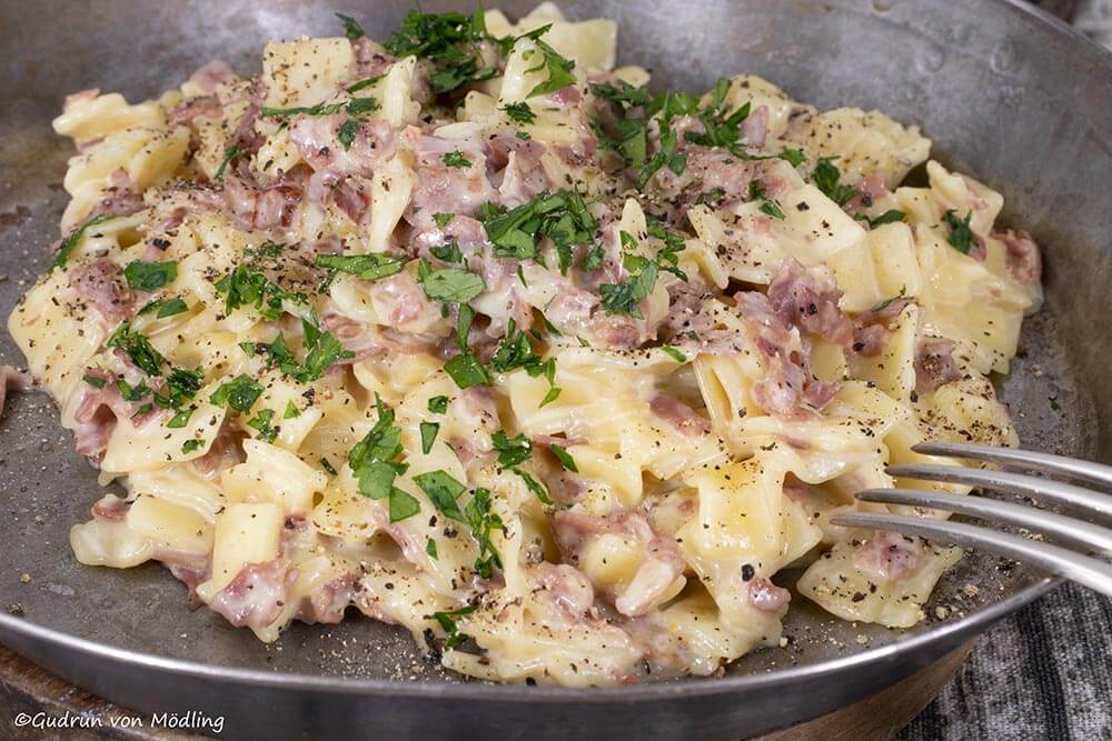 Rezept zum Ausdrucken wie immer hier: Schinkenrahmfleckerl