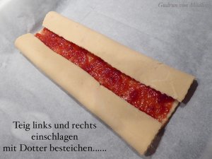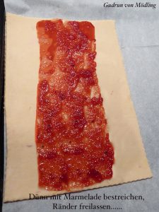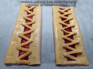Den Teig auswalken, Rechtecke mit 20 x 40 cm ausradeln, Streifen ausradeln, mit Marmelade füllen, einschlagen, mit Ei bestreichen, verzieren und etwa 30 Minuten goldbraun backen und überzuckern.