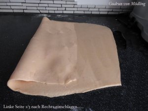Den Teig 2 aus walken, den Teig 1 darin einschlagen und wie einen Blätterteig zusammenlegen, „dreschen“ und ausrollen und zwischen jedem Bearbeiten eine halbe Stunde kühl rasten lassen. Das ganze mindestens 5 mal wiederholen.