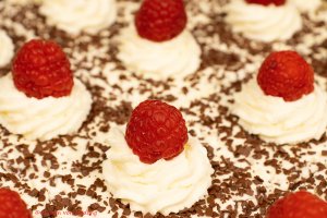 Ich habe dann extra noch 250 ml Schlagobers geschlagen, die Tupfen aufgespritzt und mit den Himbeeren belegt.