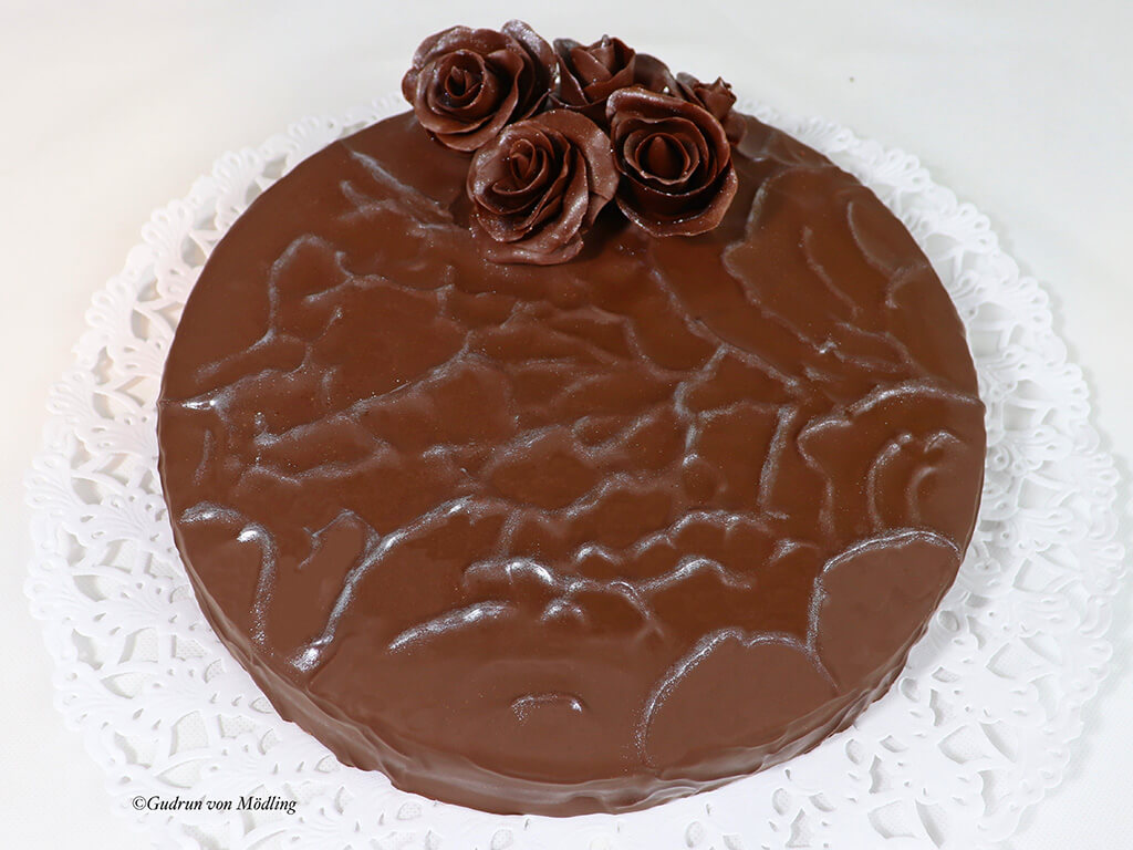 Tja, so SOLLTE es gehen 🙂 War auch mein Plan. Doch irgendetwas lief diesmal schief. Die Glasur wollte nicht gleichmäßig über die Torte rinnen und machte ganz feine Wellen. Das hat mich aber so gestört, dass ich kurzerhand mit der Torte in der linken Hand ins Badezimmer geeilt bin, den Haarföhn eingeschaltet habe und die Schokoglasur in alle Richtungen verblasen habe. Dies hatte zur Folge, dass diese unregelmäßigen Erhebungen entstanden. Zufrieden haben ich dann die Glasur trocknen lassen und die Erhöhungen mit essbarem Silberpuder bestrichen. Leider kommt das auf den Fotos nicht so gut zur Geltung. Dann hab ich die Rosen auf der Torte drapiert und fertig war die Sacher à la Guggi 🙂