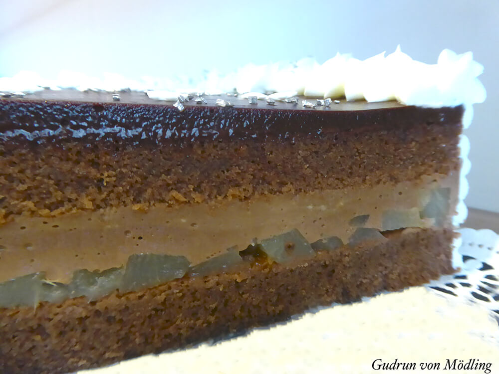 Hier wie immer das Rezept zum Ausrucken: Schokotorte mit Birnen und Nougatmousse