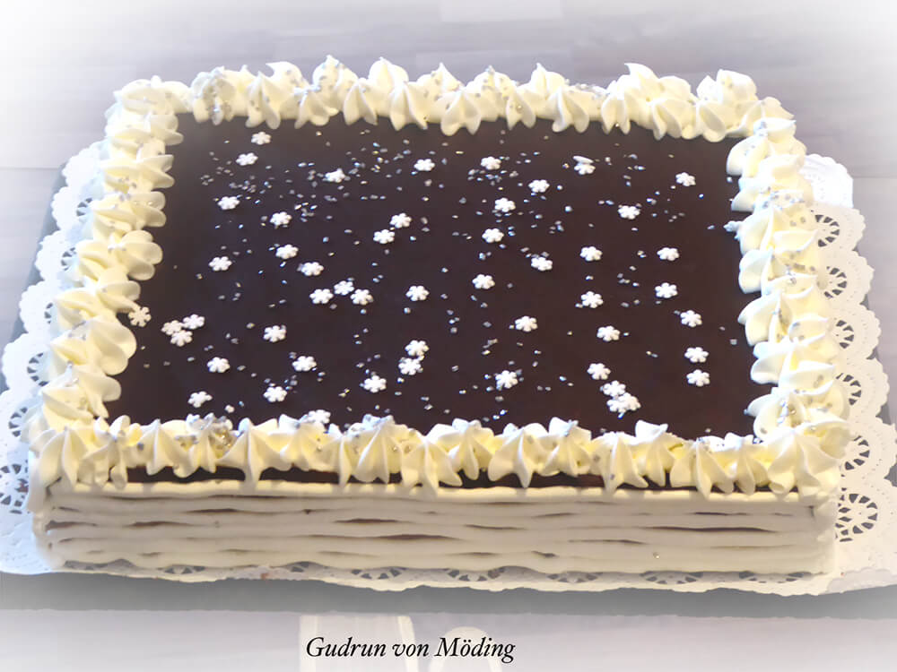 Ich habe die Ränder etwas beschnitten damit die Torte ganz gerade wird, denn durch das Blech hat die Torte keine richtigen Ecken.