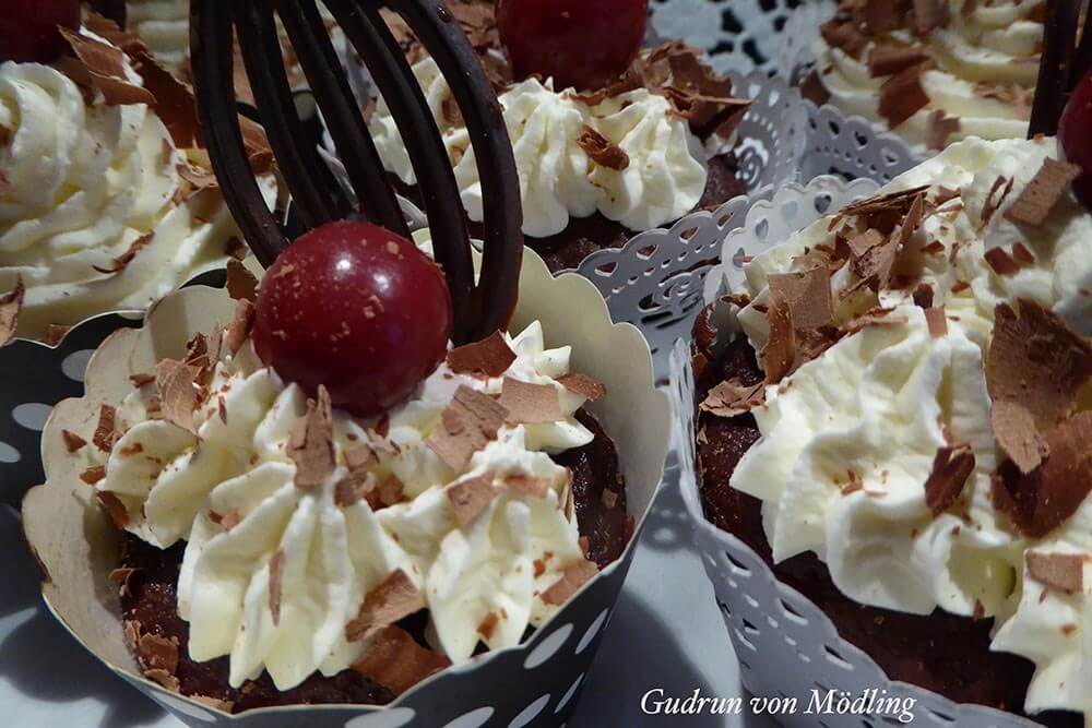Schlagobers (Sahne) steif schlagen, etwas Kirschwasser hinzufügen und Muffins mit dem Spritzbeutel verzieren. Mit Schokoflocken und 1 Kirsche garnieren.